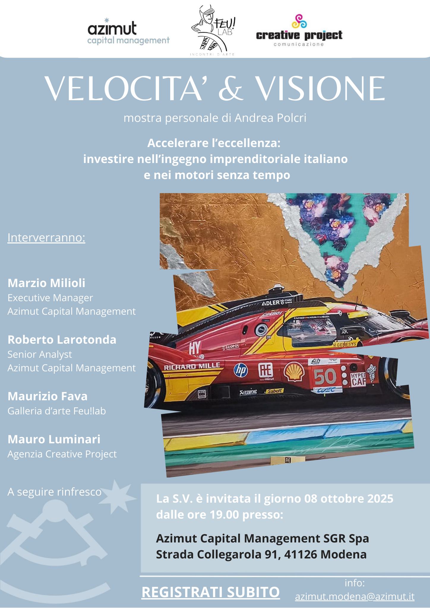 Modena Dopo il grande successo della tappa bolognese, la mostra personale di Andrea Polcri – “Velocità & Visione” approda nella città dei motori. Un’esposizione che f
