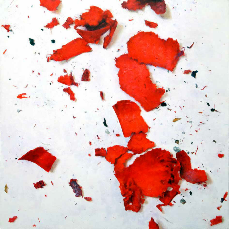 Nella cultura tradizionale, il rosso dei petardi è il simbolo della festa e della protezione, utilizzato per propiziare la fortuna. L’artista ne immortala il “dopo”, focalizzandosi sul silenzio che rimane dopo la festa, sulla materia accartocciata e sui frammenti di carta che rimangono a terra una volta terminato il frastuono. Ad enfatizzare il silenzio c’è lo sfondo bianco che decontestualizza l’evento rendendolo ancora più “silenzioso”. Il pittore che celebra il silenzio che segue l’evento, trasformando un residuo urbano in una reliquia poetica che conserva l’energia della celebrazione appena trascorsa.
