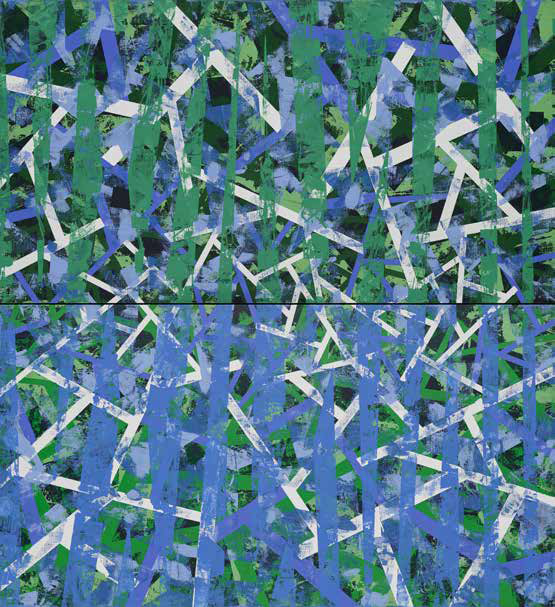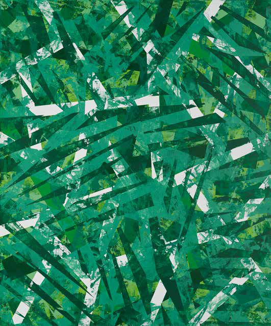 La composizione è dominata da una sovrapposizione ritmica di frammenti e pennellate nelle tonalità del verde, dello smeraldo e del lime, che creano un senso di profondità e vibrazione organica. Proprio come in una sinfonia visiva, l’artista fonde l’espressione astratta occidentale con la matericità della carta, dando vita a una danza moderna dove ogni segno sembra muoversi tra luci e ombre boschive.