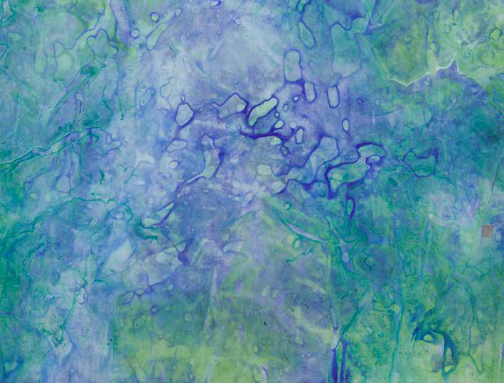 In quest’opera di Qian Wu, la superficie cartacea diventa il luogo di un’esplorazione cromatica eterea, dove le sfumature del viola e del verde si fondono in una sinfonia visiva che richiama la fluidità dell’acqua e la delicatezza di un giardino astratto.