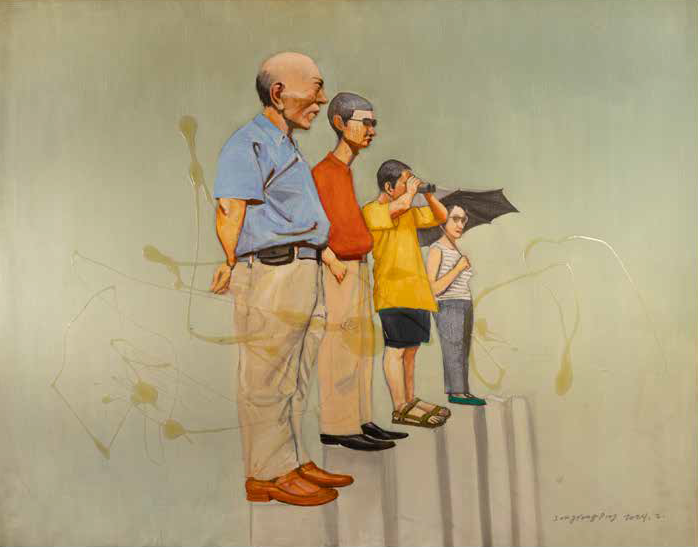 In questo dipinto Song Yongping mette in scena una potente allegoria del disorientamento generazionale nella Cina contemporanea. Quattro figure, rappresentanti diverse età e stadi della vita, sono schierate sull’orlo di un precipizio architettonico, con lo sguardo rivolto verso un orizzonte che appare svuotato di ogni punto di riferimento.